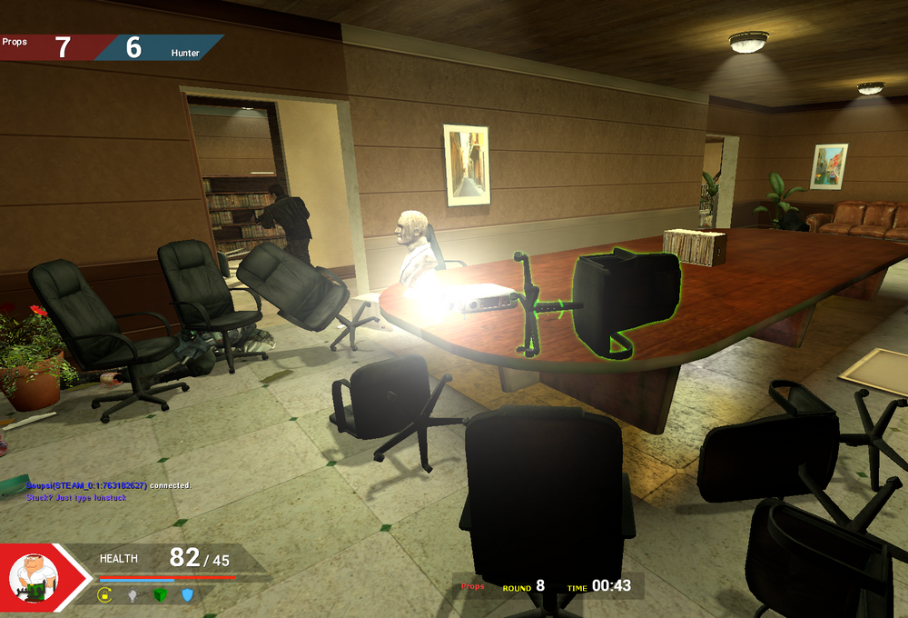 Prop Hunt is one of the most popular party game modes in Garry's Mod. Prop Hunt consists of 2 teams, props and seekers. The props have the ability to shift into items on the map, and must evade the seekers. Seekers must find the props on the map before the timer goes up, or else they will die.