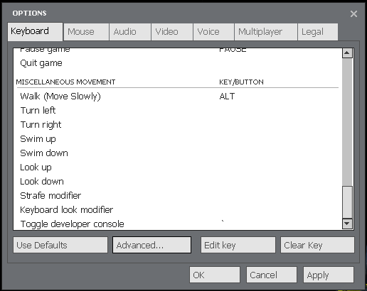 Any key that has a letter on your keyboard (ex. k) has the "Keybind Name" as that respective letter (ex. bind "k" "say I love Garry's Mod!"}. Those binds have been omitted from this list for conciseness.