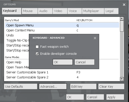 First off, you're going to enable developer console. To start, you will need to bind your open console key. Navigate to the "Keyboard" section of options, click Advanced, then check the "enable developer console" tick.