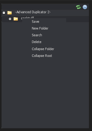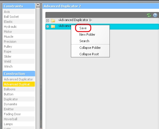 Now that your dupe is copied into your toolgun, you can save it to a folder for future use. Navigate back to the Adv Dupe 2 menu. Right Click on the Advanced Duplicator 2 folder. Click the "Save" button to save your dupe.
