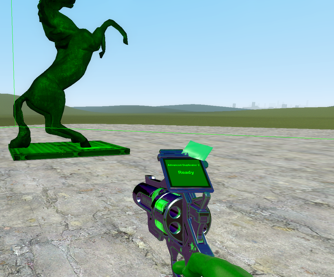 Once you have configured your settings, go back in game with the Advanced Duplicator 2 Toolgun selected. Hold down the SHIFT key and Right Click to enable "Area Copy Mode". Right Click to save everything within the radius of your Area Copy. This radius is shown as the green outline in the image above.