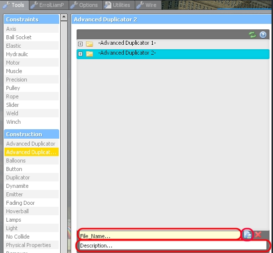 Next, name your dupe and save it to the "Advanced Duplicator 2" folder for future use. Click the paper next to the X to save the dupe.