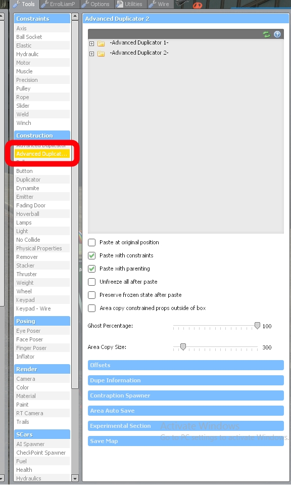 - Advanced Duplicator 2 - Advanced Duplicator 2 is a tool that allows you to save your own builds directly to your computer. Saved builds are put directly into your computer as a .txt file. These files can be shared with other GMod players directly.