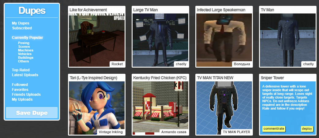 To spawn dupes in GMod, navigate to the spawn menu. Click the "Dupes" tab on the top tab of the menu. Using this tab, you can decide which builds you'd like to spawn into your game. Once you have found a build that you like, click the "Deploy" button and left click with the toolgun.