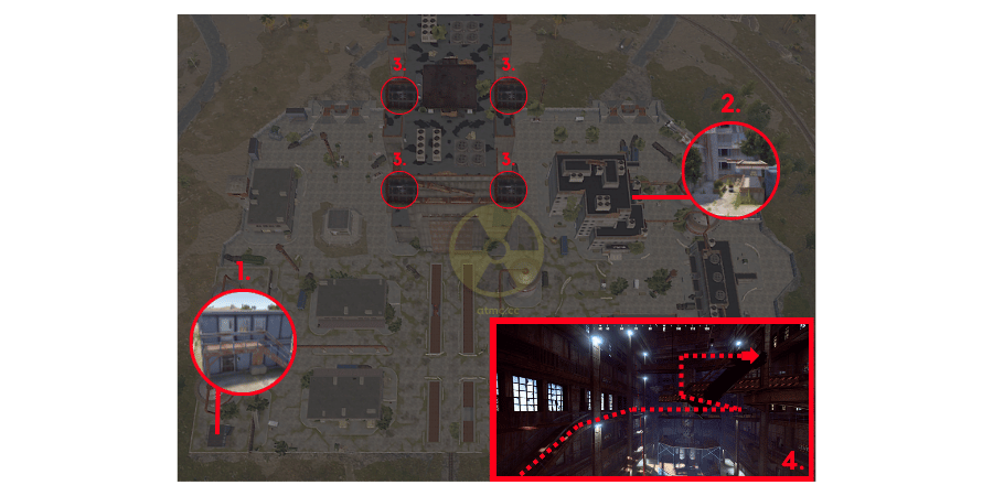 The most important spots to loot are at the bottom left of the map. Be careful though, as this is the area that the Bradley APC tends to patrol. If the Bradley APC sees you, you will probably die unless you have the explosives to kill it.
